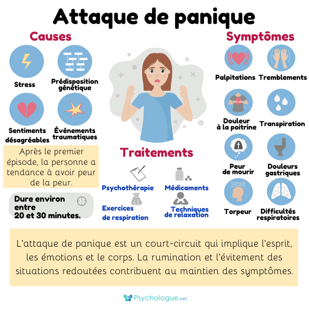 Les symptômes physiques de l’attaque de panique peuvent être : douleur ou gêne thoracique, sensation de vertige, d’instabilité ou d’évanouissement, impression d’étouffement, bouffées de chaleur ou frissons, nausées ou douleurs abdominales, paresthésies ou sensations de picotement, palpitations ou fréquence cardiaque accélérée, sensations de dyspnée ou d’étouffement, sueurs, tremblements…